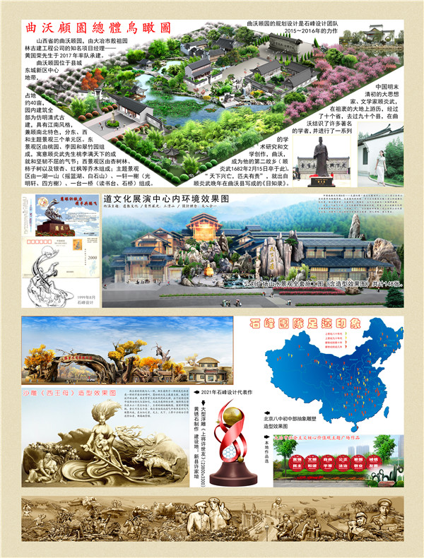 团队有各类中高级艺术、技术人才,历经36年的工作实践,作品遍及中国大陆,从首都北京至边疆伊犁;从东方的抚远、粮仓北大荒到南方的海口、中山;从中州的郑州、洛阳、开封至荆楚大地的武汉、洪湖、荆门、宜昌;从高原盆地的侯马、临汾至潇湘名山九嶷山、常德、益阳……印下了我们殷实的足迹。